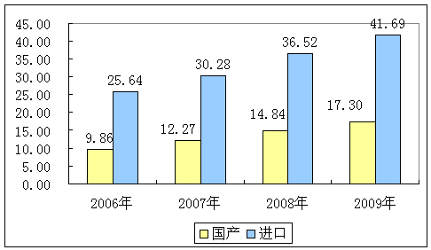 2006-2009年国内市场国产及进口产品销售额比较