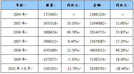 2004-2010年维生素原和其他维生素及其衍生物和混合物出口量值统计 单位:千克;美元