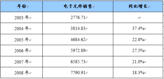 2003-2008年我国电子元件销售收入统计 单位:亿元