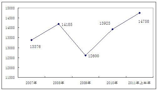 2007-2011年上半年我国高抗冲型ACR市场均价走势图