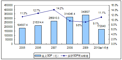 由上图可知,近年来我国国内生产总值(GDP)一直保持高速增长,增长幅度均超过了9%。虽然受世界性经济危机的影响,我国2008和2009年的GDP增长幅度有所下降,但2010年的前2个季度的经济增长幅度出现回升。