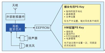 蓝牙协议栈及耳机配置文件存储在只读存储器(ROM)中,包含在耳机软件中。称为“永久存储关键码(PS Key)”的模块专用的芯片参考参数用来设置信息,PS Key则存储在外部的小型可重写存储器(EEPROM)中。