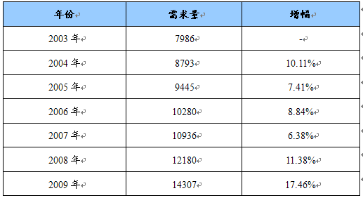 2003-2009年动态心电图仪市场需求规模统计表 单位:台