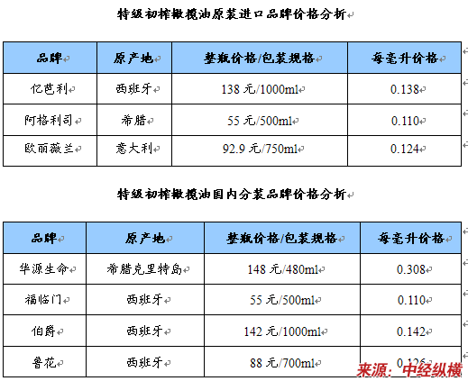 通过对抽检品牌橄榄油的价格对比发现,原装进口的特级初榨橄榄油的规格在500ml、1000ml,价格区间在50~80元/500ml,其中价格最高的是亿芭利、伯爵牌特级初榨橄榄油。