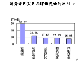 消费者购买各品牌橄榄油的原因显示,在消费者作购买选择时,质量好和比较有名是非常重要的影响因素。而质量好与品牌知名度有密切的相关性。前者一般是通过后者来感知,说明厂商坚持走品牌营销之路的重要性。这也正是各主要橄榄油厂商正逐步关心自己的营销战略,开始走品牌之路和精细化营销之路的原因所在。