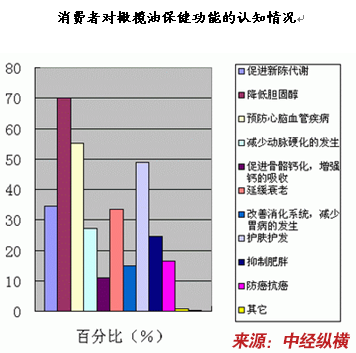 由于橄榄油具有预防心脑血管疾病、降低胆固醇、延缓衰老、护肤护发、防癌抗癌等功效,广大消费者对橄榄油具有较高的认知度。据调查显示,70.10%的人了解橄榄油可以降低胆固醇,55.05%的人知道橄榄油可以预防心脑血管疾病,48.76%的人了解橄榄油可以护肤护发,只有0.19%的人不知道橄榄油对人体的益处。由此可知,大部分消费者了解橄榄油对人体的益处。