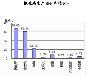 由图得出,68%的人认为最有名的橄榄油生产国是西班牙,61.14%的人认为是意大利,按照所占比例情况,最著名的橄榄油生产国依次是西班牙、意大利、希腊、法国、土耳其。仅有4.76%的被调查人员不知道著名的橄榄油生产国。