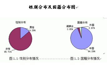 对于525个被调查人员,他们的性别、国籍和年龄分布情况如下。在被调查人员中,有450名女性,占总数的85.71%,其分布情况见图;其中,国内大陆为495人,占总体的94.29%,港澳台为16人,占3.05%,国外为14人,占2.67%,其分布情况见图。