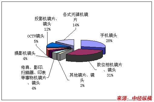 若从2009年全球光学元件应用产品产值来看,数位相机镜头镜片产值约占31%,手机镜头产值则占有28%,两者合计即超过总产值接近六成,如下图所示。