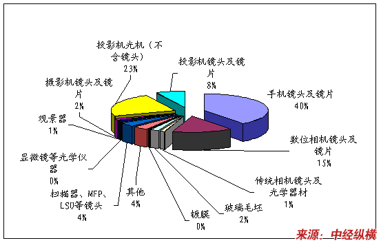 若以应用产品端来看,2009年产值比例如下图所示,手机镜头与镜片占比最高,占四成左右。而投影机光机(不含镜头)次之,约占23%,至於数位相机则居於第三位,约占15%。