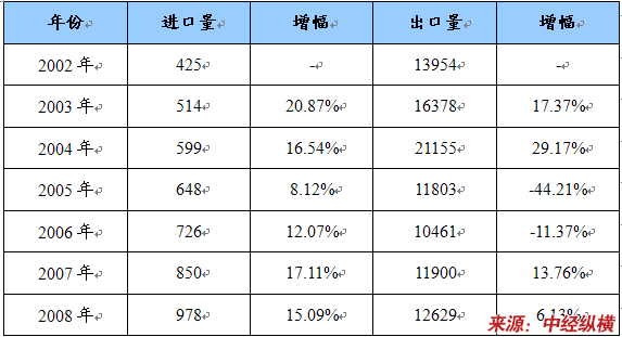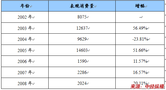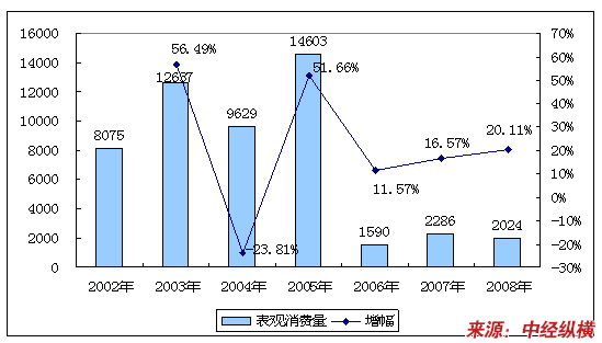 2002—2008年对讲机产品表观消费量统计表 单位:千台