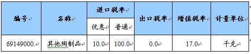 粉煤灰烧结陶粒计入税则号69149000,以下是其他陶制品进出口税率表,由于国家海关对粉煤灰烧结陶粒没有单独分类统计,因此进出口数量及金额没有精确统计,但是从我国市场状况来看,国内产品部分出口到海外地区。