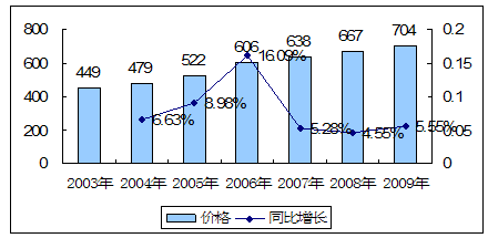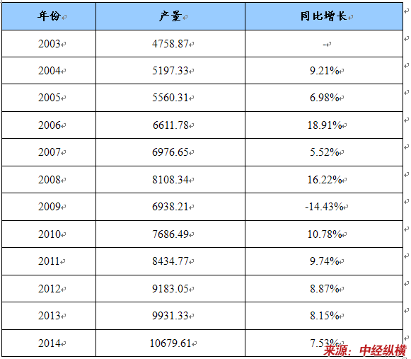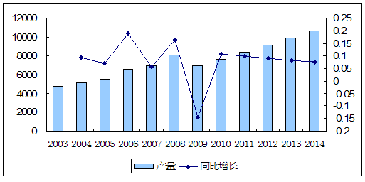 2006年、2008年干木材产量增长最快,由于2008年基数高,2009年木材产量较2008年有所下降,不过,下降趋势在2010年将停止,预计2010年其增速将达到10.78%,到2010年产量预计将达到10679.61万立方米。