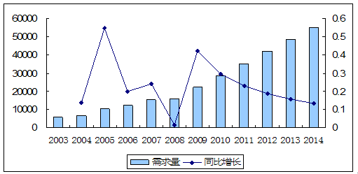2005年木材需求已经达到1.03亿m3,增长了54.46%。预计到2014年,中国木材需求量约为5.5亿m3,国内缺口巨大,供需矛盾有增无减。