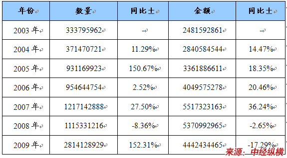 2003-2009年干木材进口量值统计 单位:立方米;美元