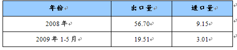 2008-2009年5月我国多功能立体声蓝牙耳机进出口量值 单位:万套