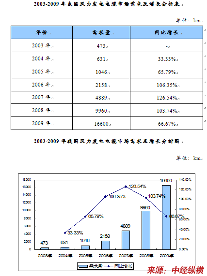 中国现有风电装机约为50万千瓦,以年均40%的速度上升,到2020年将上升至1亿千瓦,占2020年电力装机10亿千瓦的10%,占发电站总量的5%。从国外风力发电的发展过程来看,到2050年,我国风电将由2020年预计的1亿千瓦的装机,上升到约16亿千瓦的装机。这对我国的电线电缆市场来说,无疑是一个积极地信号,也是一块诱人的大蛋糕。当前我国电线电缆市场竞争激烈、日趋饱和。因此,积极寻找市场空白, 研究 开发出具有巨大增长潜力的风电用电缆是电线电缆制造企业提高市场份额、提升整体竞争力的重要手段。