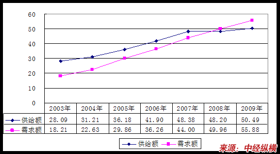 2003-2009年我国电脑针织机械产品供需平衡对比图