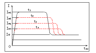 用该方式起动电机时,输出电压以设定的时间平稳上升,同时输出电流以一定的速率增加,当起动电流增至限定值IM时,电流保持恒定,直至起动完成如图: