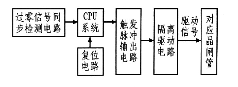 单片机控制的晶闸管触发器主要由同步信号检测、CPU硬件电路、复位电路和触发脉冲驱动电路4部分组成。CPU通过检测电路获知触发信号,依据所要控制的电路要求,通过编程实现预定的程序流程,在相应时间段内通过单片机I/O端输出触发脉冲信号,复位电路可保证系统安全可靠的运行。