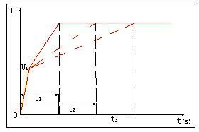用该方式起动电机时,软起动器的电压快速升至U1,然后在设定的时间t内逐渐上升,电机随着电压的上升不断加速,达到额定电压和额定转速时,起动过程完成,如图:
