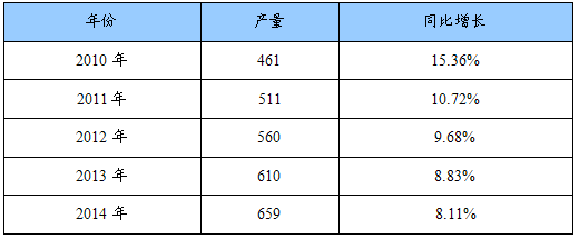2010-2014年我国聚氨酯产量预测表