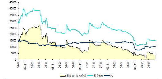 2004-2009年MDI与聚苯乙烯价差越来越小