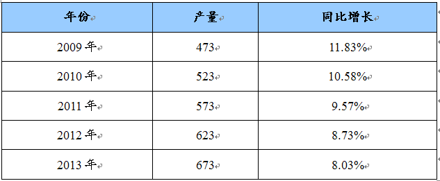 2009-2013年我国复塑彩钢板产量预测表 单位:万吨