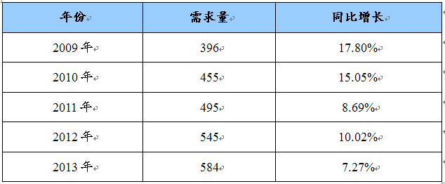2009-2013年我国复塑彩钢板需求量预测表 单位:万吨