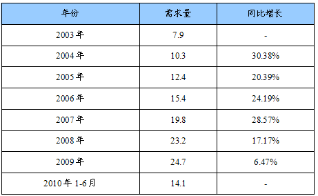 2003-2010年6月我国电梯装潢需求量及其增长情况统计表