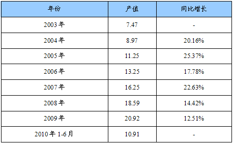 2003-2010年6月我国电梯装潢产值及其增长情况统计表