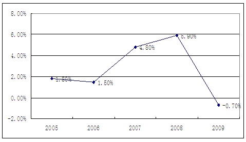 2009年国内生产总值335353亿元,比上年增长8.7%。分产业看,第一产业增加值35477亿元,增长4.2%;第二产业增加值156958亿元,增长9.5%;第三产业增加值142918亿元,增长8.9%。第一产业增加值占国内生产总值的比重为10.6%,比上年下降0.1个百分点;第二产业增加值比重为46.8%,下降0.7个百分点;第三产业增加值比重为42.6%,上升0.8个百分点。