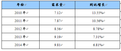 2010-2014年我国富马酸需求量增长预测表 单位:万吨
