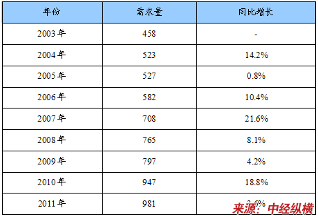 2003-2011年中国蛋黄卵磷脂需求量及同比增长