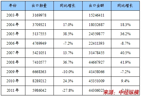 2003-2011年中国磷脂出口数量及金额统计