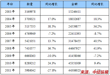 2003-2011年中国磷脂进口数量及金额统计