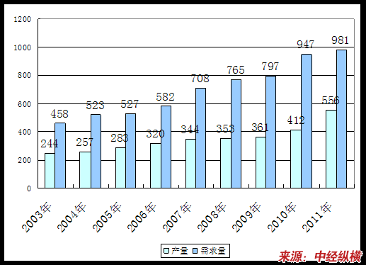 2003-2011年中国蛋黄卵磷脂产量、需求量对比图
