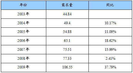 2003-2009年我国低压铸造件需求量统计表
