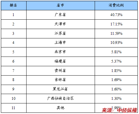 2009年1-5月我国电池专用金属锂消费前十省市分布