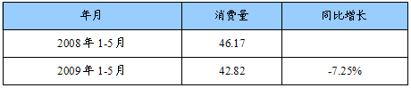 我国锂电池工业发展速度较快,生产锂电池消耗的金属锂逐年增加。2009年1-5月,我国累计消耗金属锂数量达到42.82吨,受全球经济危机的影响,同比2008年消耗减少7.25%。