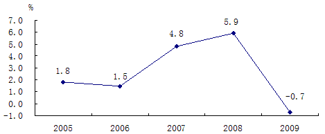 全年居民消费价格比上年下降0.7%,其中食品价格上涨0.7%。固定资产投资价格下降2.4%。工业品出厂价格下降5.4%,其中生产资料价格下降6.7%,生活资料价格下降1.2%。原材料、燃料、动力购进价格下降7.9%。农产品生产价格下降2.4%。农业生产资料价格下降2.5%。70个大中城市房屋销售价格上涨1.5%,其中新建住宅价格上涨1.3%,二手住宅价格上涨2.4%;房屋租赁价格下降0.6%。