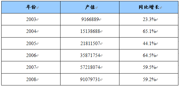 2003-2008年我国石油钻采专用设备制造产值增长情况 单位:千元,%