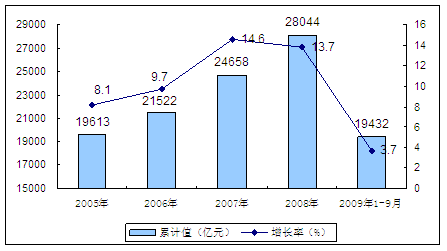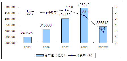 初步测算,2009年全年国内生产总值335353亿元,按可比价格计算,比上年增长8.7%,增速比上年回落0.9个百分点。