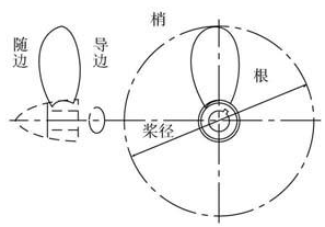 由船尾后面向前看时,所见到螺旋桨桨叶的面称叶面或压力面,另一面称为叶背或吸力面,桨叶与桨毂连接处称叶根,其外羰称叶梢。螺旋桨正车旋转时,桨叶前边即先与水相遇的一边称导边,其后边即另一边称随边。如图所示。