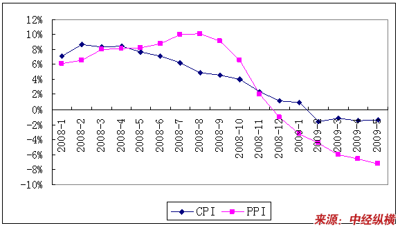 具体而言,世界经济结束金融恐慌进入可预期的衰退阶段,金融危机已经转化为经济危机,预计外需在半年内还将持续同比下跌15%以上,中国的实体经济将不得不继续等待机遇;政府通过直接投资扩大了公共需求,通过补贴诱导与金融信贷条件改善,较好地刺激了内部市场需求,投资在三季度会保持在30%以上的增速,而以汽车与房地产为代表的消费也将维持在15%左右的名义增长水平上。此外,全年通货膨胀率预计在0.5%。09年2-8月中国经济进入长达7个月的通货紧缩期,9月后物价将开始变正,11月与12月将维持在2%的水平上,全年物价上涨率预计不超过0.5%。