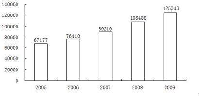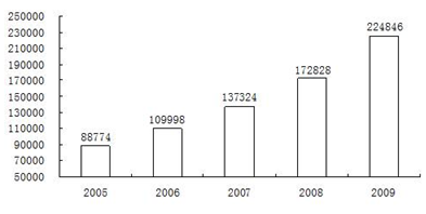 2009年国内生产总值335353亿元,按可比价格计算,比上年增长8.7%,增速比上年回落0.9个百分点。分季度看,一季度增长6.2%,二季度增长7.9%,三季度增长9.1%,四季度增长10.7%。分产业看,第一产业增加值35477亿元,增长4.2%;第二产业增加值156958亿元,增长9.5%;第三产业增加值142918亿元,增长8.9%。