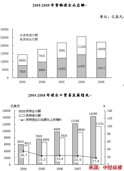 2009年国内进出口总额全年下降,自11月份由降转升。全年进出口总额22073亿美元,比上年下降13.9%。11月份进出口总额同比涨幅由负转正,当月增长9.8%,12月份增长32.7%。去年全年的出口12017亿美元,下降16%;进口10056亿美元,下降11.2%。进出口相抵,去年的贸易顺差1961亿美元,比上年减少994亿美元。