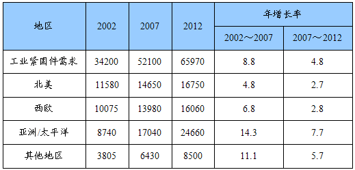 许多其它耐用品产量将提高,为紧固件供货商带来了商机,然而,总体市场增长将在某程度上受到制约,一方面有来自粘合剂和其它可选择的连接技术的竞争,另一方面,居民住房建设缓和下来。