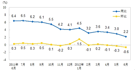2012年上半年,居民消费价格同比上涨3.3%,涨幅比一季度回落0.5个百分点,比上年同期回落2.1个百分点。其中,城市上涨3.3%,农村上涨3.3%。