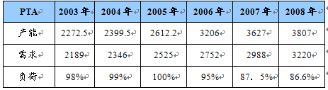2003年-2008年亚洲PTA产能及需求 单位:万吨